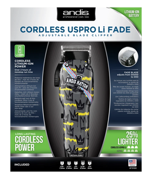 The Limited Edition Andis Nation Cordless USPRO Li Fade clipper runs for over 2 hours on a single charge. It is powerful and lightweight at less than 10oz. The side adjustment lever makes it perfect for tapers and fades. The blade adjusts from 00000 to 000. The rotary motor takes 90 minutes to fully charge. The clipper can be used with or without the cord.